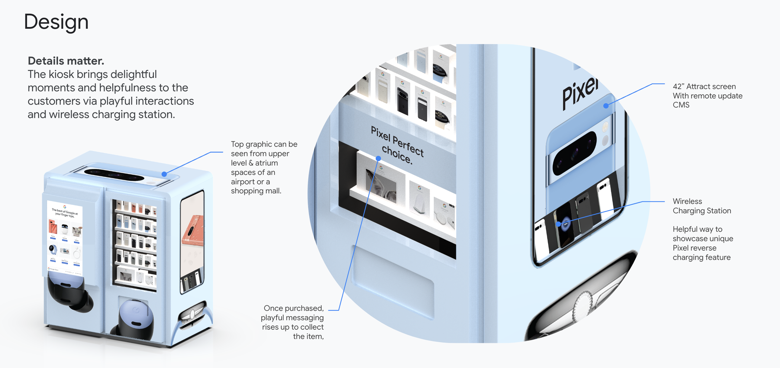 Our team was tasked with coming up with a visually striking vending machine that would be placed in airports around the world. The vending machines would carry various products from Google hardware products. As the lead on graphics, my role was to come up with a design using existing product photography that showcased the top three items on the exterior of the vending machine.